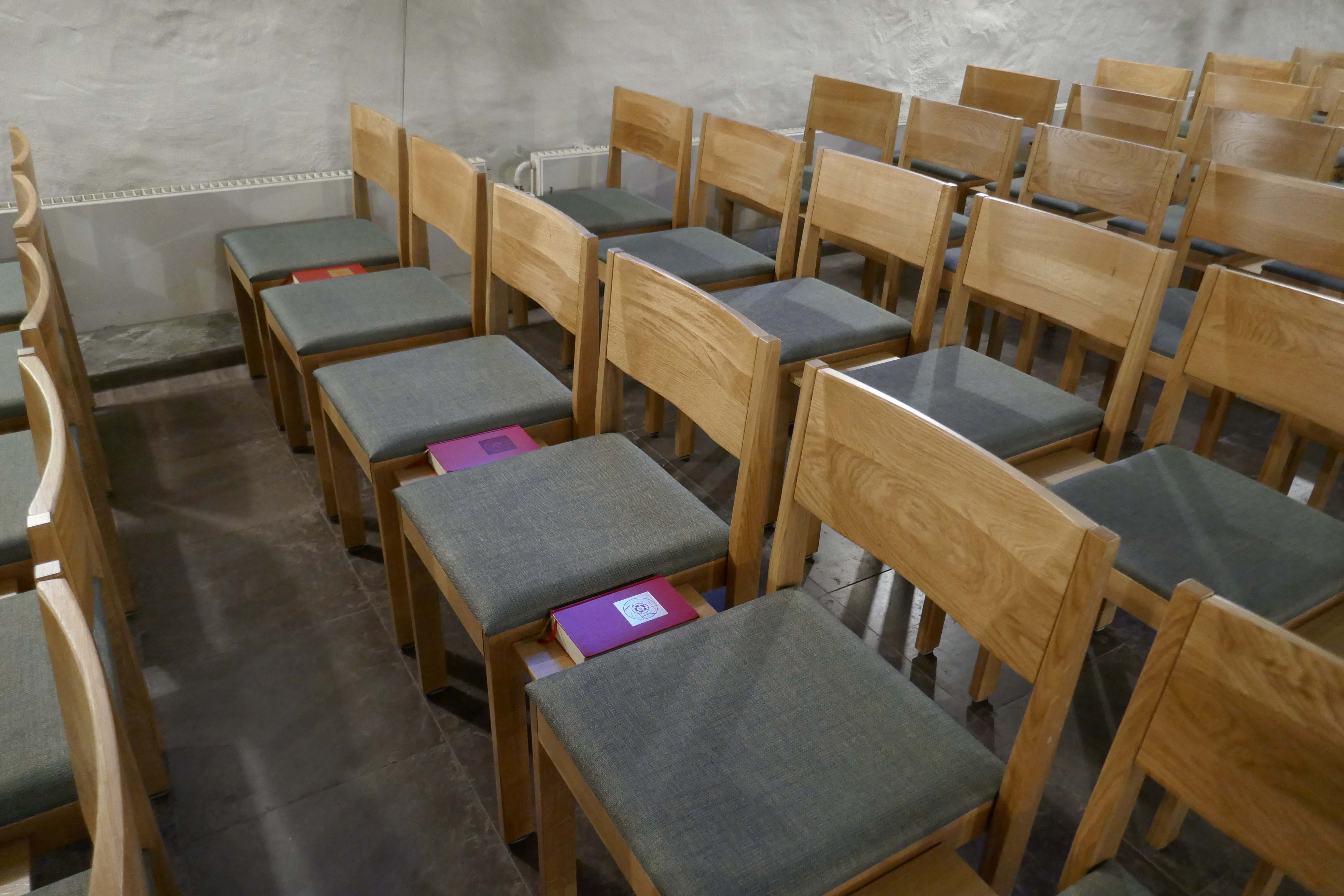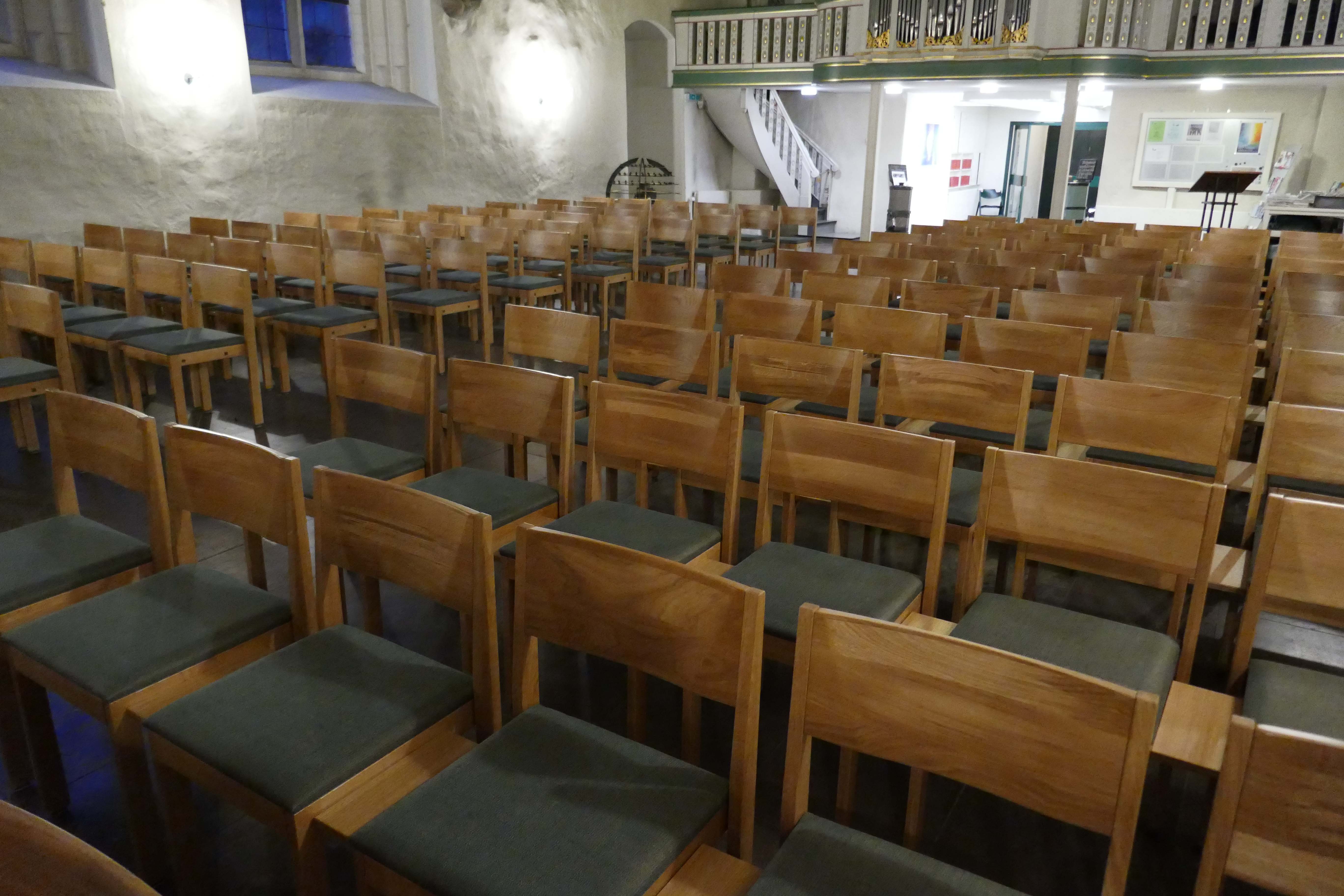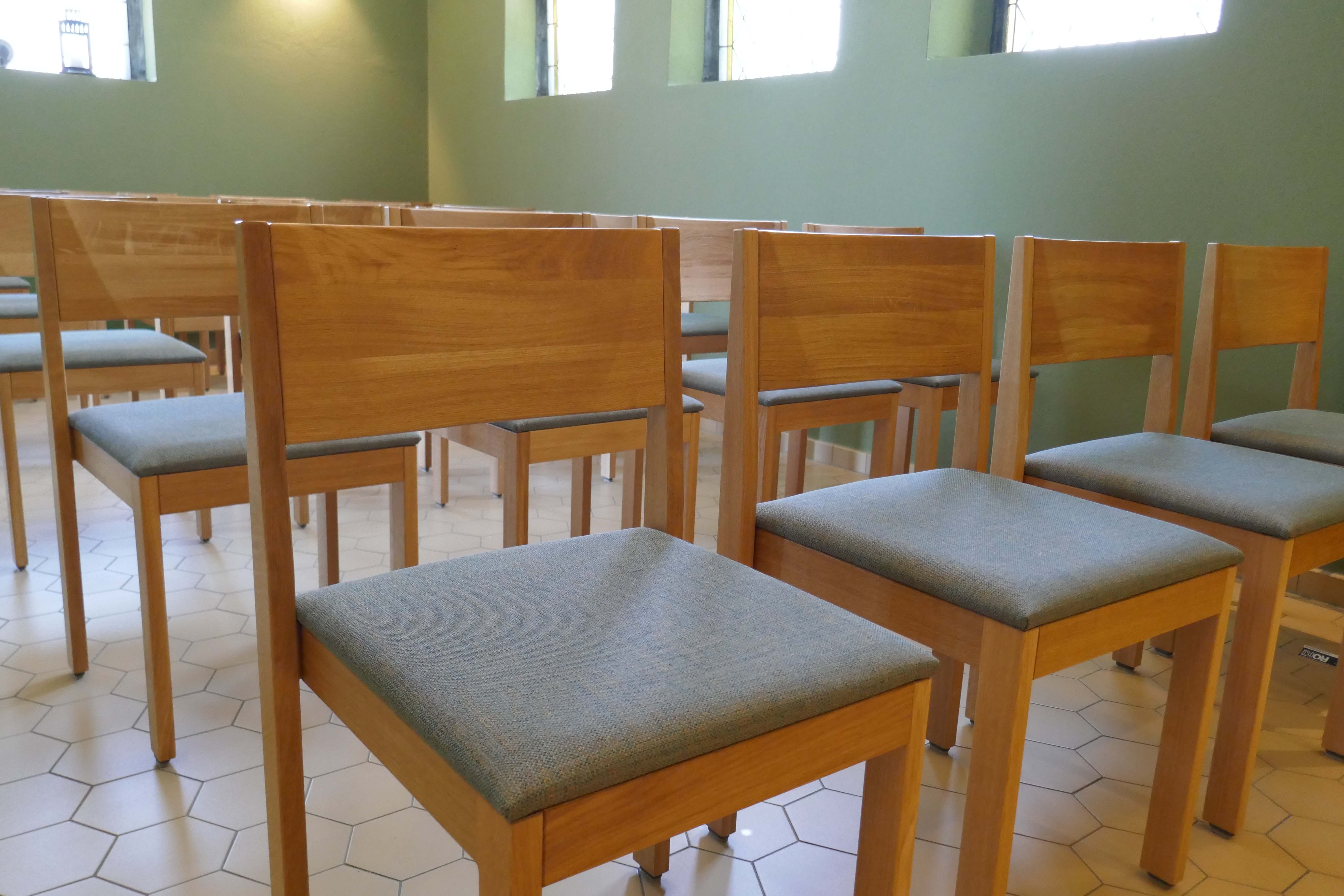 Flexibel einsetzbarer Kirchenstuhl mit Armauflage