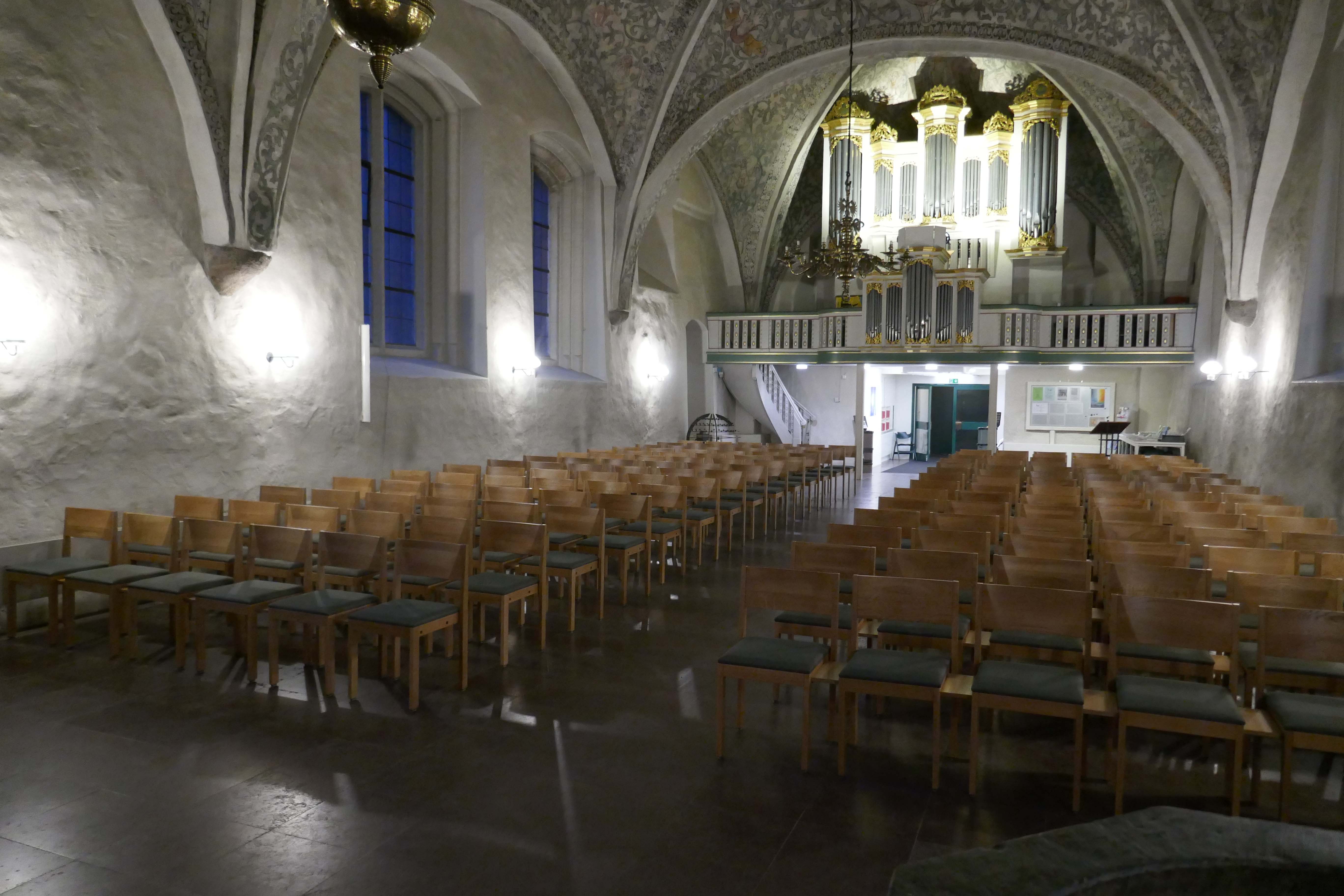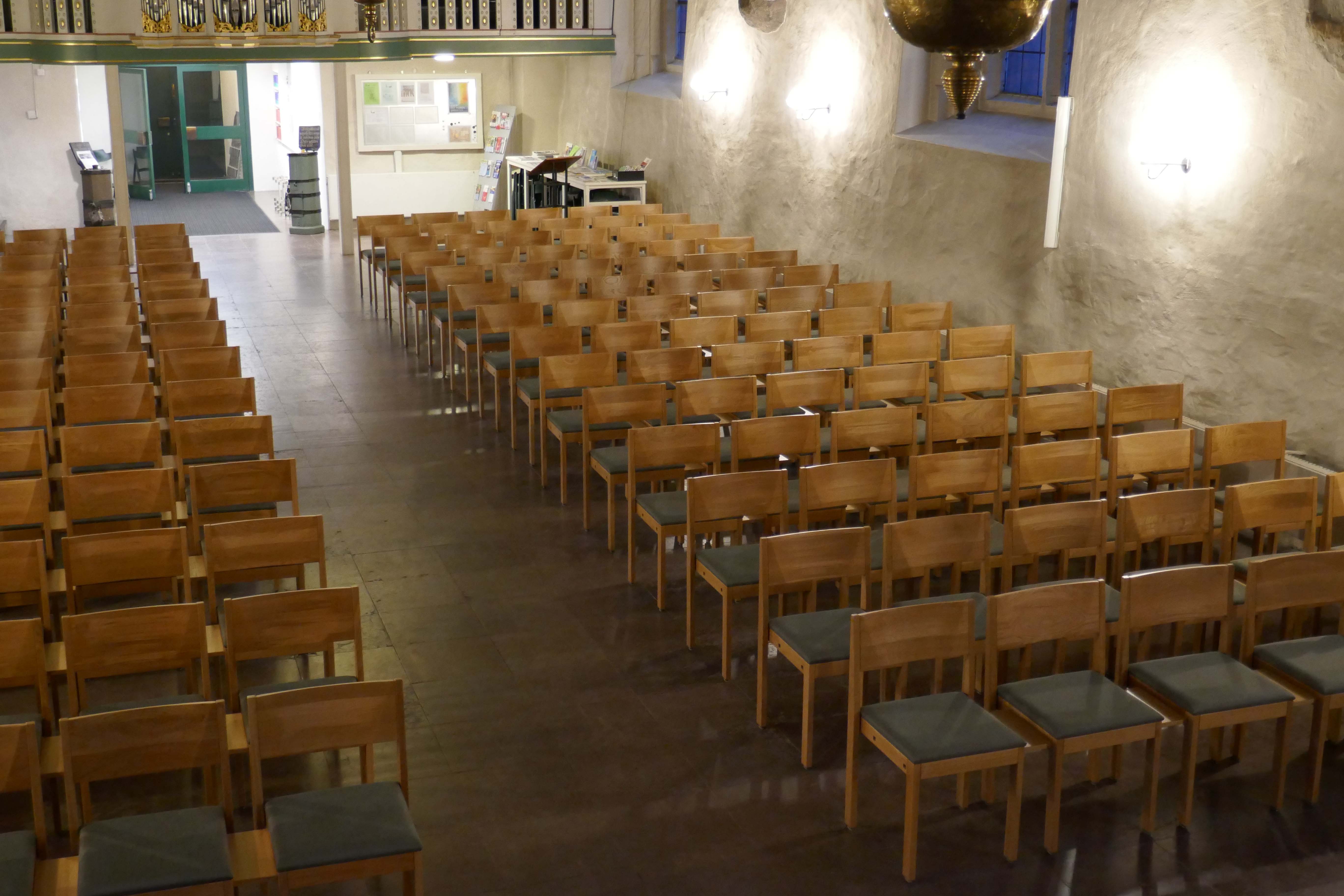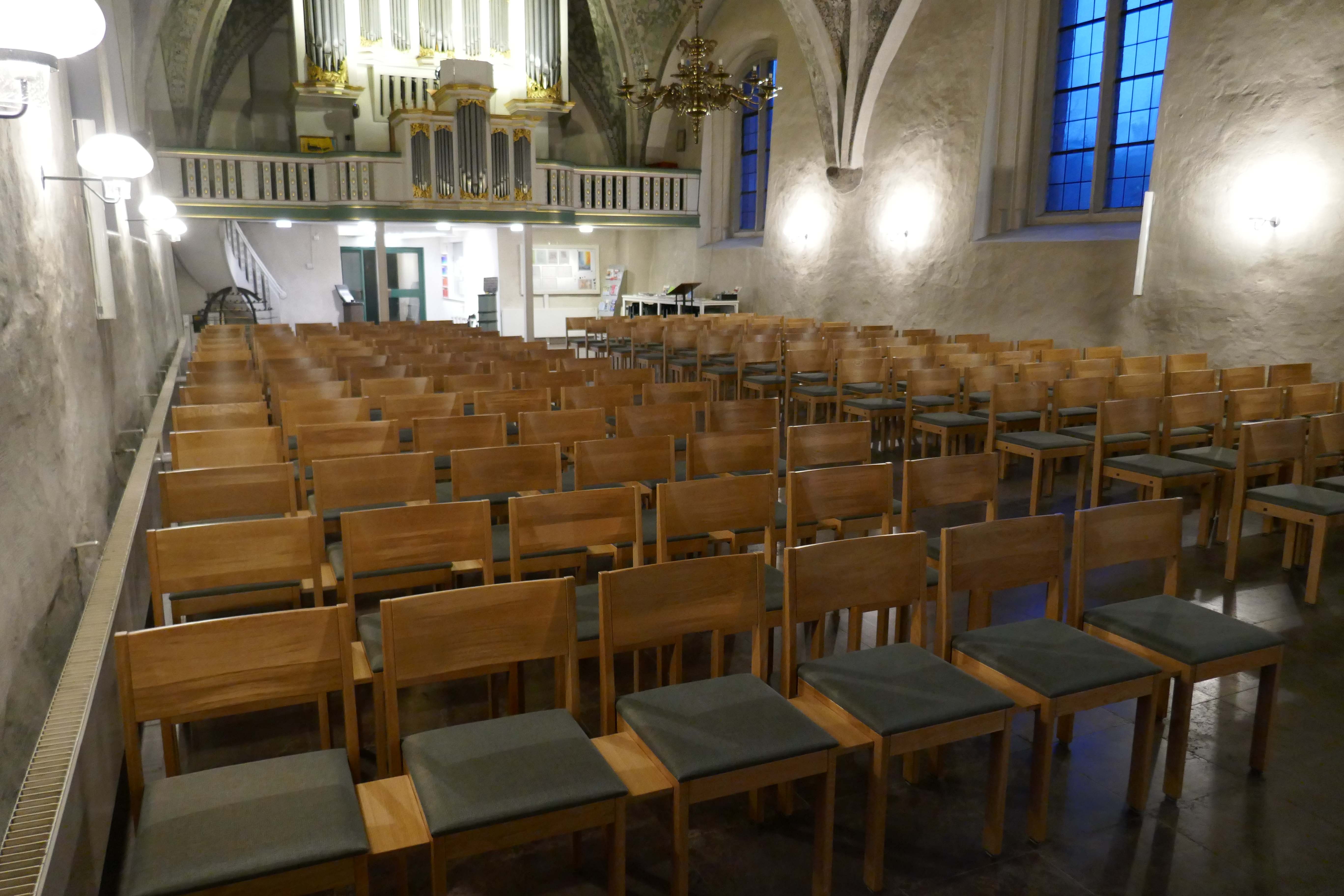 Flexibel einsetzbarer Kirchenstuhl mit Armauflage