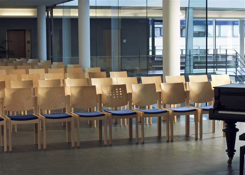 Gemeindestuhl Classica. Gottesdienstformen, welche die Teilnehmer in das Geschehen der Feier mit einbeziehen, Konzerte, Aufführungen, öffentliche Veranstaltungen besonderer Art stellen Anforderungen an das Platzangebot in Altarnähe. Für die Bestuhlung in Kirchengebäuden bieten wir Ihnen verschiedene Modelle an, wie hier das Modell CLASSICA 113, die mit Kniebank. Die Armauflage folgt elegant der Form der Rückenlehne und vermittelt einen leichten, fast schwebenden Eindruck. Die Kniebank rastet beim Hochklappen sanft ein. Sie ist auch abnehmbar erhältlich, damit der Stuhl weiterhin gestapelt werden kann. Wünschen Sie eine Bemusterung in Ihrer Kirche? Jetzt anfordern.