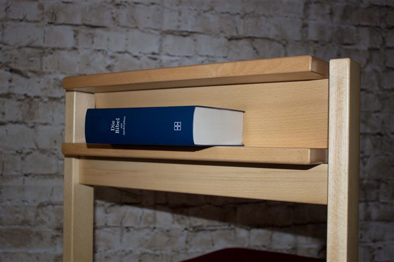 Kirchenstuhl Jacobus I für Ihre Kirchengemeinde mit integrierter Buchablage und Armlauflage. Dekor Buche