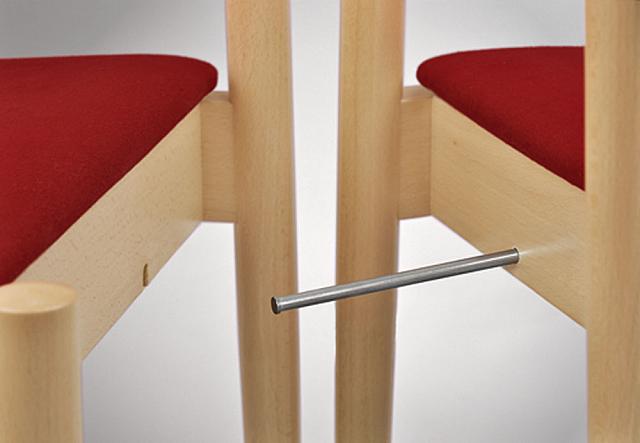 Rundstollen 40 mm, Buche, Hinter- und Vorderstollen leicht schräg gestellt. Fußabschlüsse oben leicht ballig gerundet. Befestigung der Füße an den Querzargen mit verdichteter Doppelzap-fenverbindung. Gestell mit 12 Quell-Riffeldübel 50 x 12 mm verleimt. Zur weiteren Stabilität sind 4 Eckverstärkungen angebracht, die mit Minizinken mit dem Gestell verleimt sind.