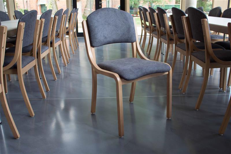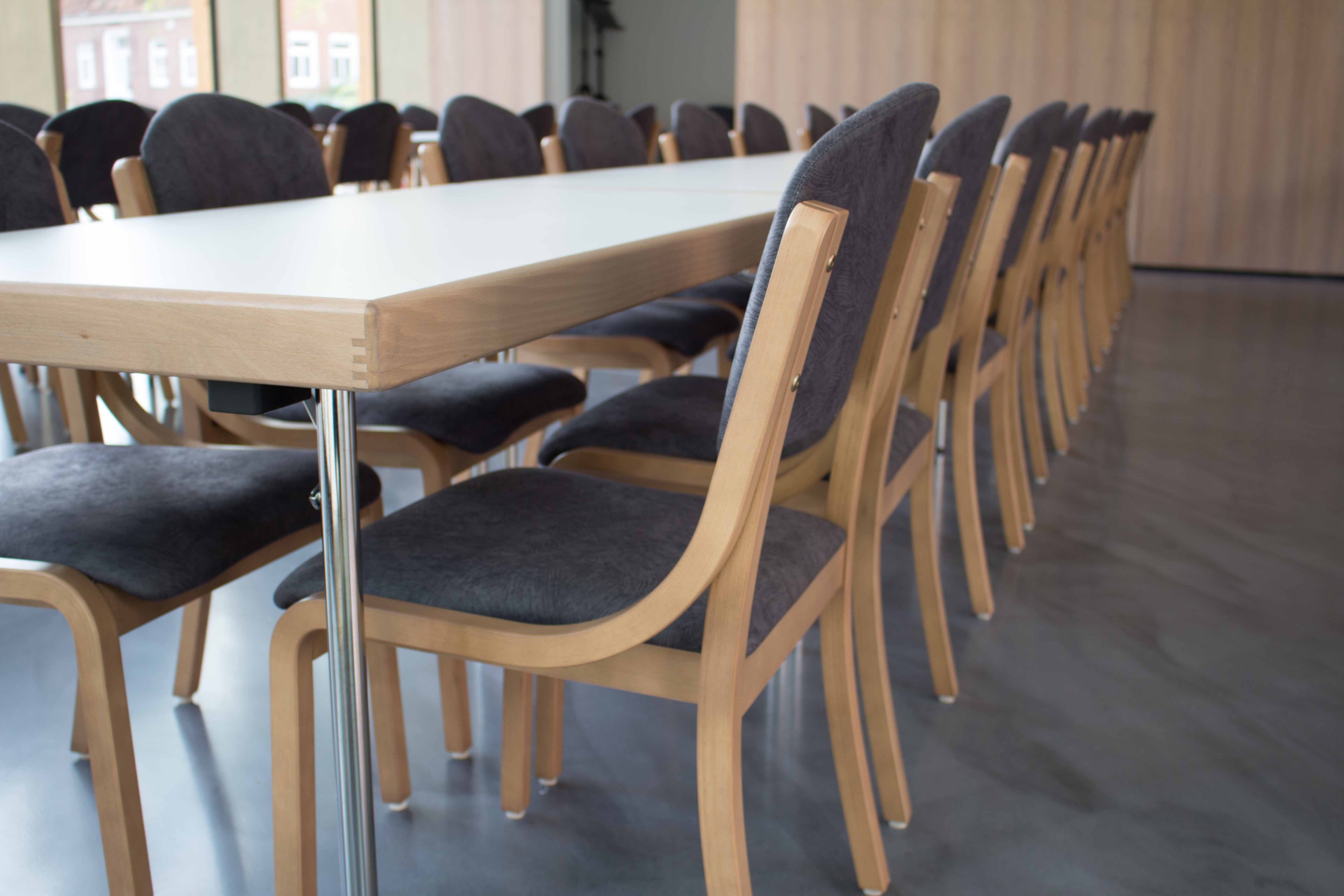 Der Schichtholz Stapelstuhl ist außerdem schwer entflammbarund damit die ideale Möblierung für Kirchengemeinden.