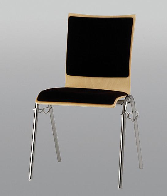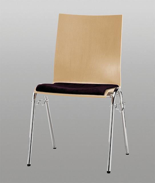 mit Lordoseunterstützung in Buche-Schichtholz aus hochdruckverpressten Buchenfurnieren mindestens 10 mm stark, mindestens 9 Lagen. Schale mit dem Gestell auswechselbar verschraubt, mit hochelastischen Zwischenlagen. Muttern gegen selbständiges Lösen gesichert. Sitz- und Rückenpolster verschraubt und auswechselbar. Polsterung mindestens 20 mm stark Schaum RG 35