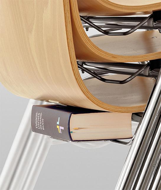 Präzisions-Stahlrohr 22 x 1.6 mm, parabelartige Seitenrohre, extra stark verchromt mit 25 µ, mit patentiertem Stapelsteg zur kippsicheren, senkrechten Stapelung von bis zu 20 Stühlen, mit nichtschmierenden Bodengleitern