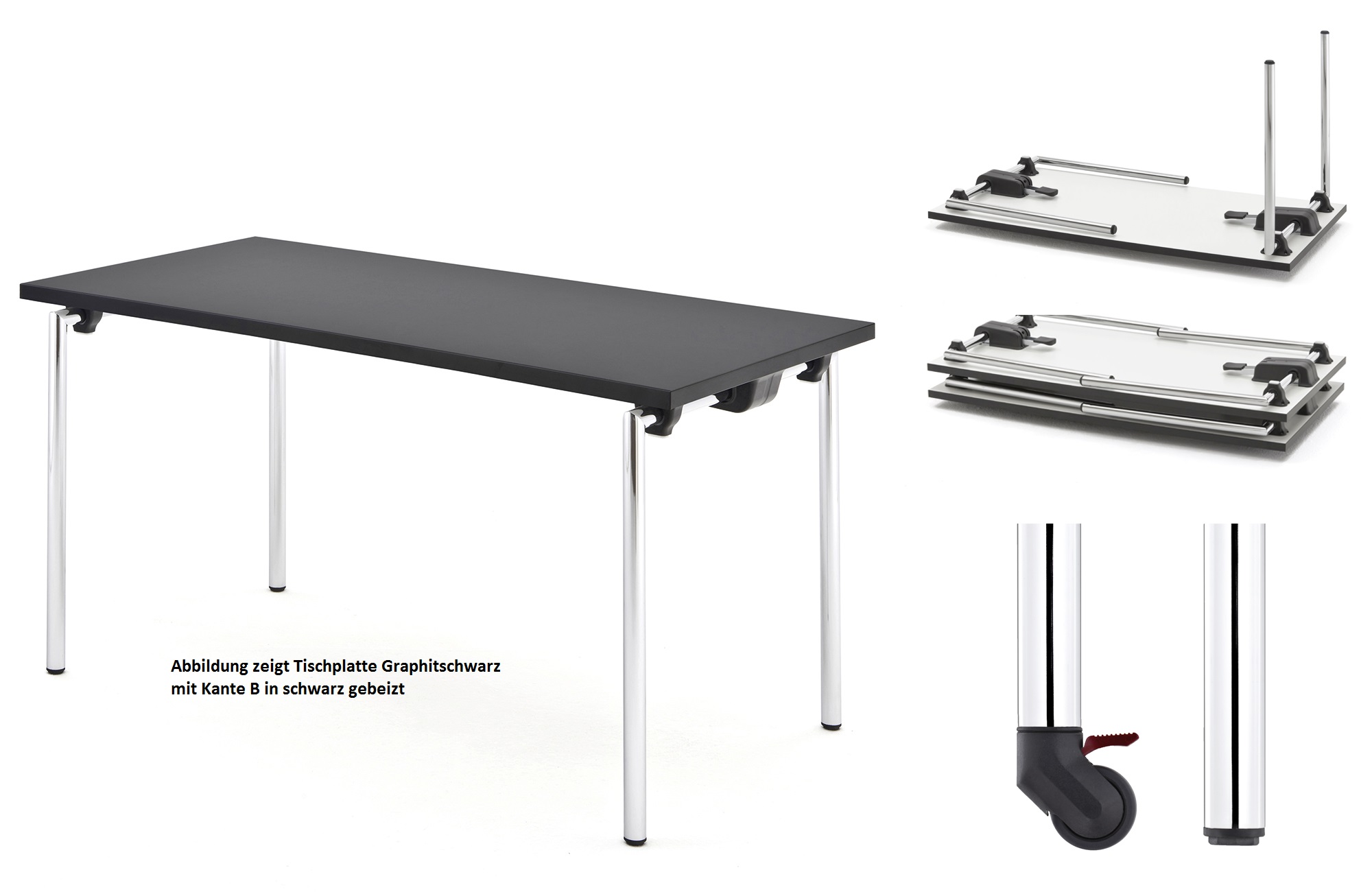 Gestell 4-Fuß aus Stahl-Rundrohr Ø 35 x 2 mm, auf Gehrung gearbeitet, verchromt, mit Höhenausgleichschrauben. Das Klapptischmodell vereint alle Merkmale, die bügellose Klapptische aufweisen müssen. Die hohe Standfestigkeit überzeugt ebenso wie ihre einfache und intuitive Bedienung. Durch die integrierte Verschiebung des Gestells klappen die Tischbeine nebeneinander ein und ermöglichen eine geringeStapelhöhe.