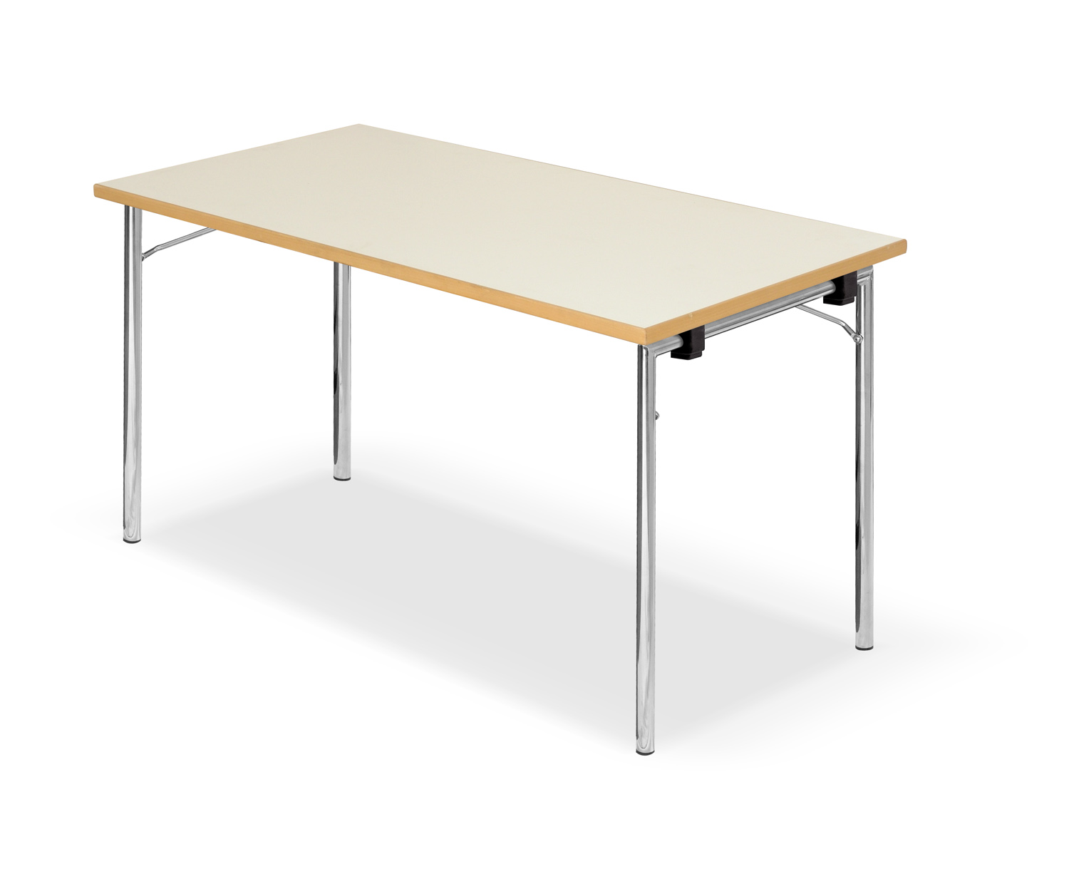 Klapptisch Modell DEMUS 3 Vierfußgestell auf Gehrung mit Bügel, verchromtes Rundrohrgestell 40 x 2 mm Ø, Höhenverstellung am Fuß, HPL-Schichtstoffplatte 30 mm stark, Laminatfurnier 0,9 mm stark, Tischplatte Standard Buche HPL