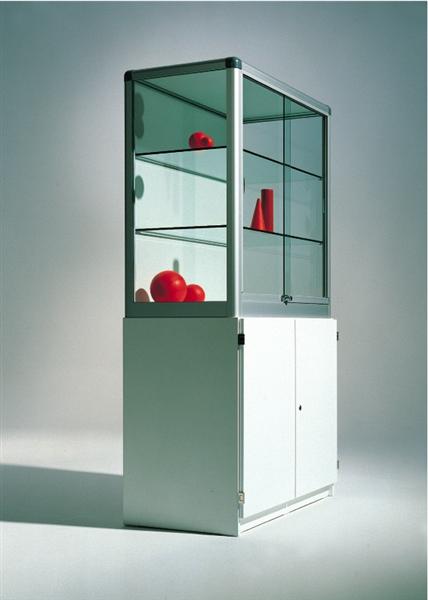 Alu-Standvitrine, oben Alu-Oberteil 98 cm hoch mit 2 verstellbaren Dickglasböden und Holzrückwand, mit Druckzylinder-Sicherheitsschloss, unten 2 Türen abschließbar (ab einer Breite von 120 cm mit Mittelwand und je 2 Fachböden im Unterschrank) ohne Montage