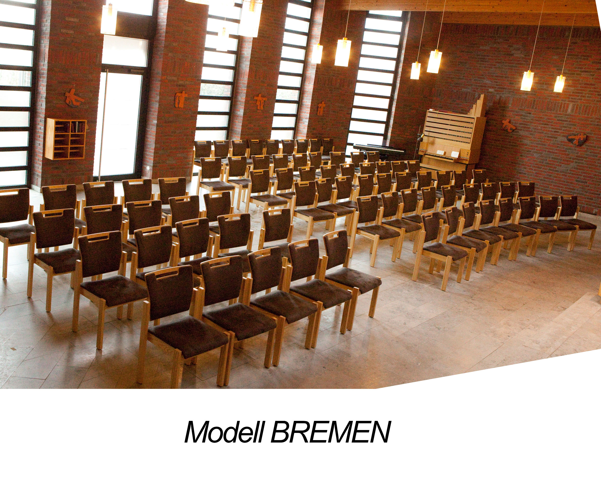 Kirchenbankstuhl SANTA 166, den Massivholzstuhl ARCA 148, den Gemeindestuhl LINGEN sowie einige weitere Modelle zur Ansicht.