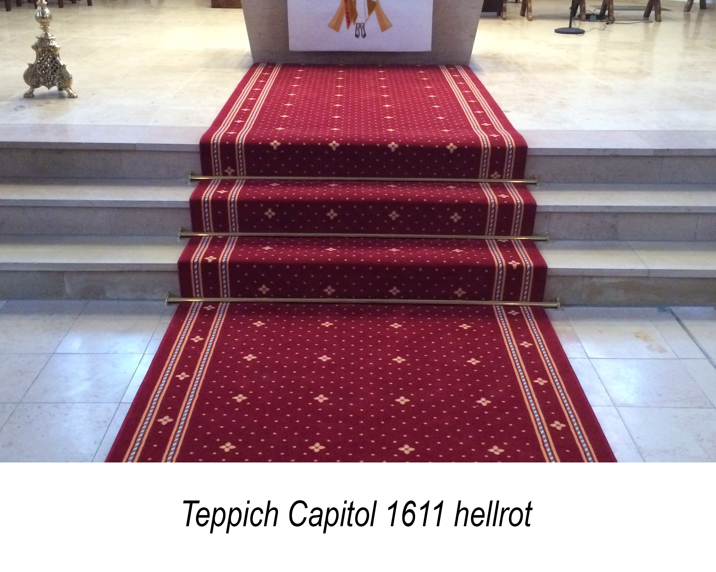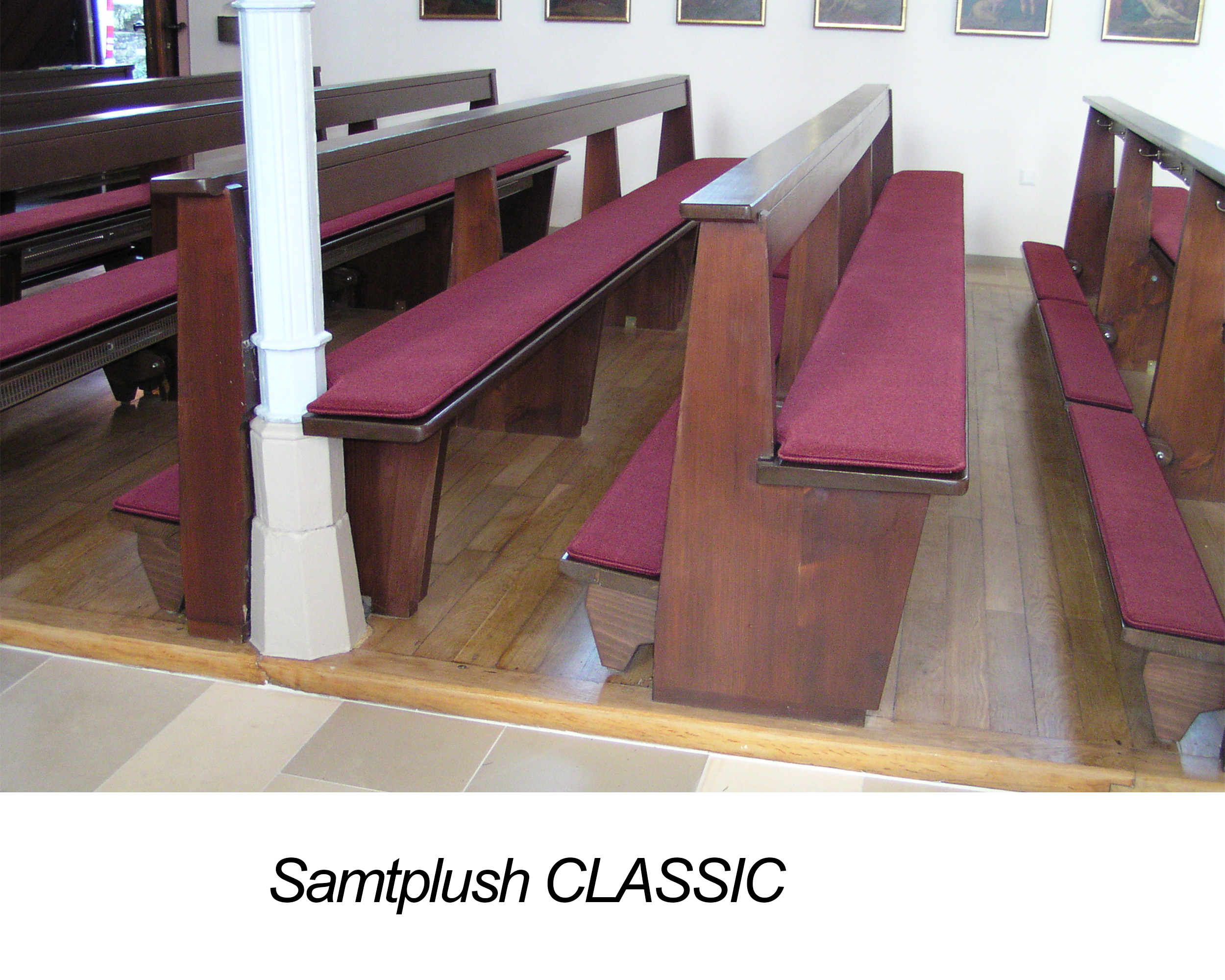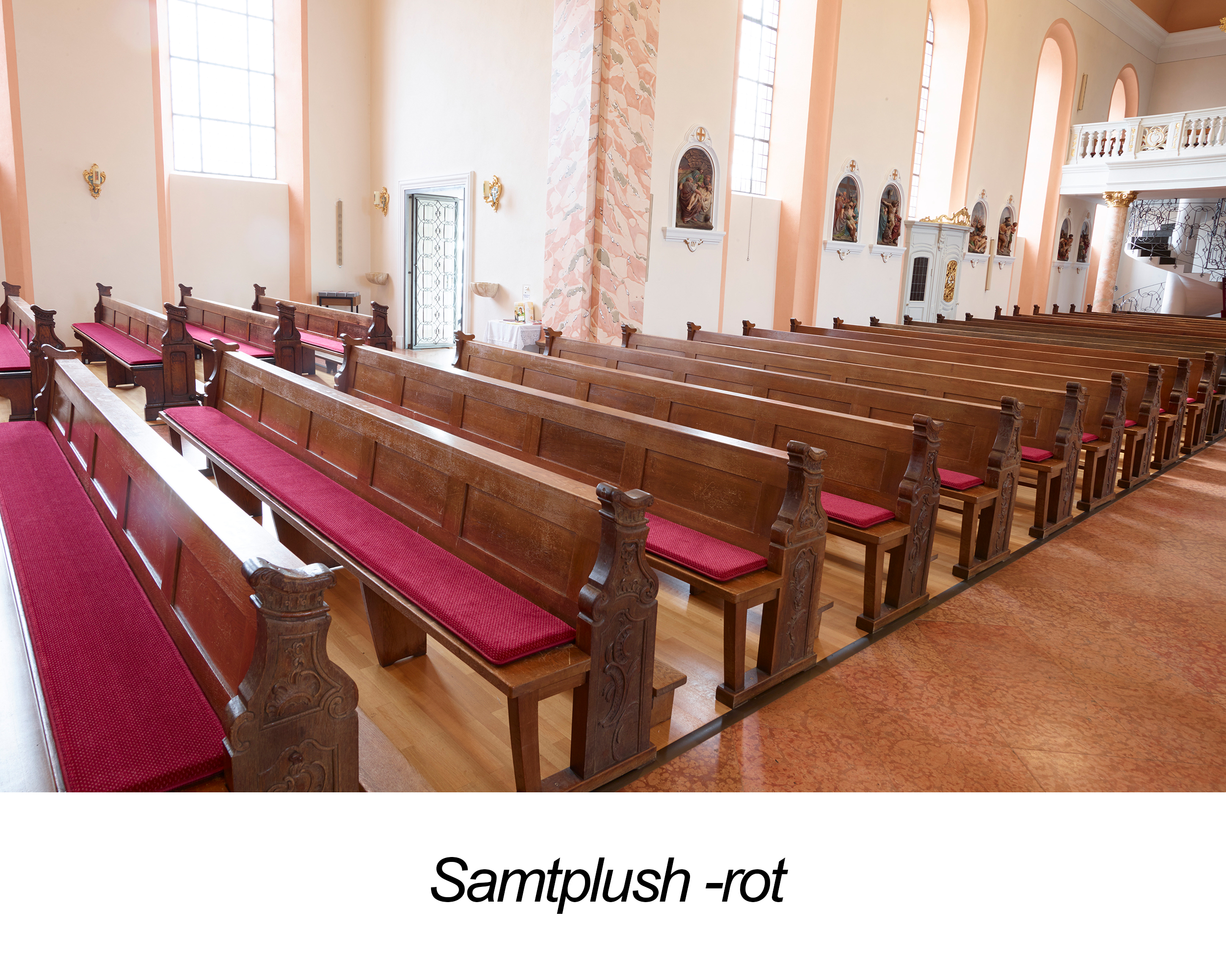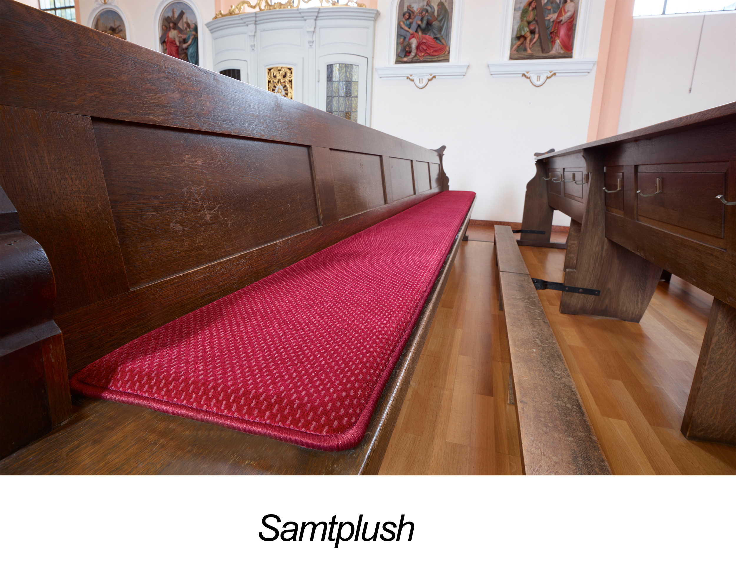 Bei uns erhalten Sie außerdem Kirchenteppiche und Kirchenbankpolster, farblich abgestimmt auf Ihre Einrichtung und auf Maß gefertigt. Auch Ausschnitte und Rundungen sind für uns realisierbar.